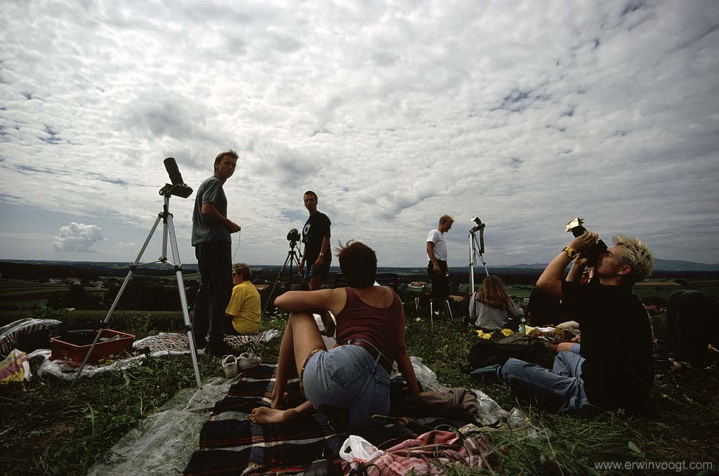 so that the Moon's disk can appear just large enough to cover the Sun's disk. On this page you see a sequence of pictures taken during the total eclipse of August 11th 1999. The pictures are taken in Bad Tatzmannsdorf, Austria. As you can see, some thin clouds appeared just before the beginning of the eclipse. Therefore I failed to take good pictures of the corona. However, due to the clouds the shadow of the Moon, the umbra, approached like a spectaculair thunderstorm. I used a wireless remote control to release the shutter of the OM2n. The pictures are taken on kodachrome 25 with a Tokina 17 mm F3.5, stopped down to F5.6. The camera was set on auto. 1 May 2006: Look here for the pictures of the solar eclips 2006 in Cirali (Çirali), Turkey. |