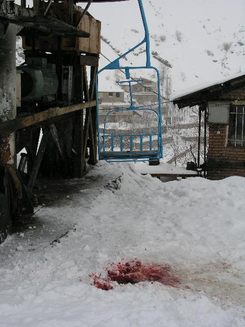 Uitzicht vanaf de piste op het plaatsje Shemshak. De stoeltjes zijn veel te klein en hangen te laag - reuze onveilig. Deze plas bloed is echter van een geslacht schaap. Want schapen slachten op de piste, waarom niet? |