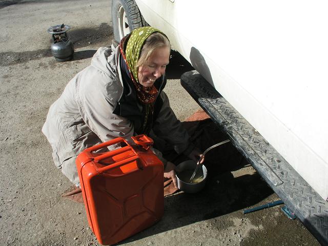 | Deze oplossing zal ons naar Tehran brengen: de motor direct aansluiten op een jerrycan. | Een auto aan het infuus, het gaf onderweg wat verbaasde blikken. |